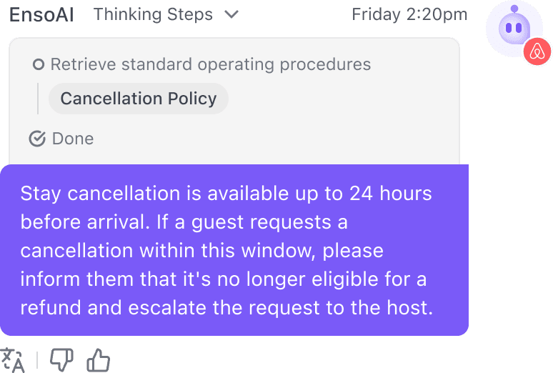 EnsoAI detecta sentimiento del huésped, resume las conversaciones para una priorización más rápida y ayuda a su equipo a centrarse en lo que más importa, ofreciendo un soporte rápido y eficaz.