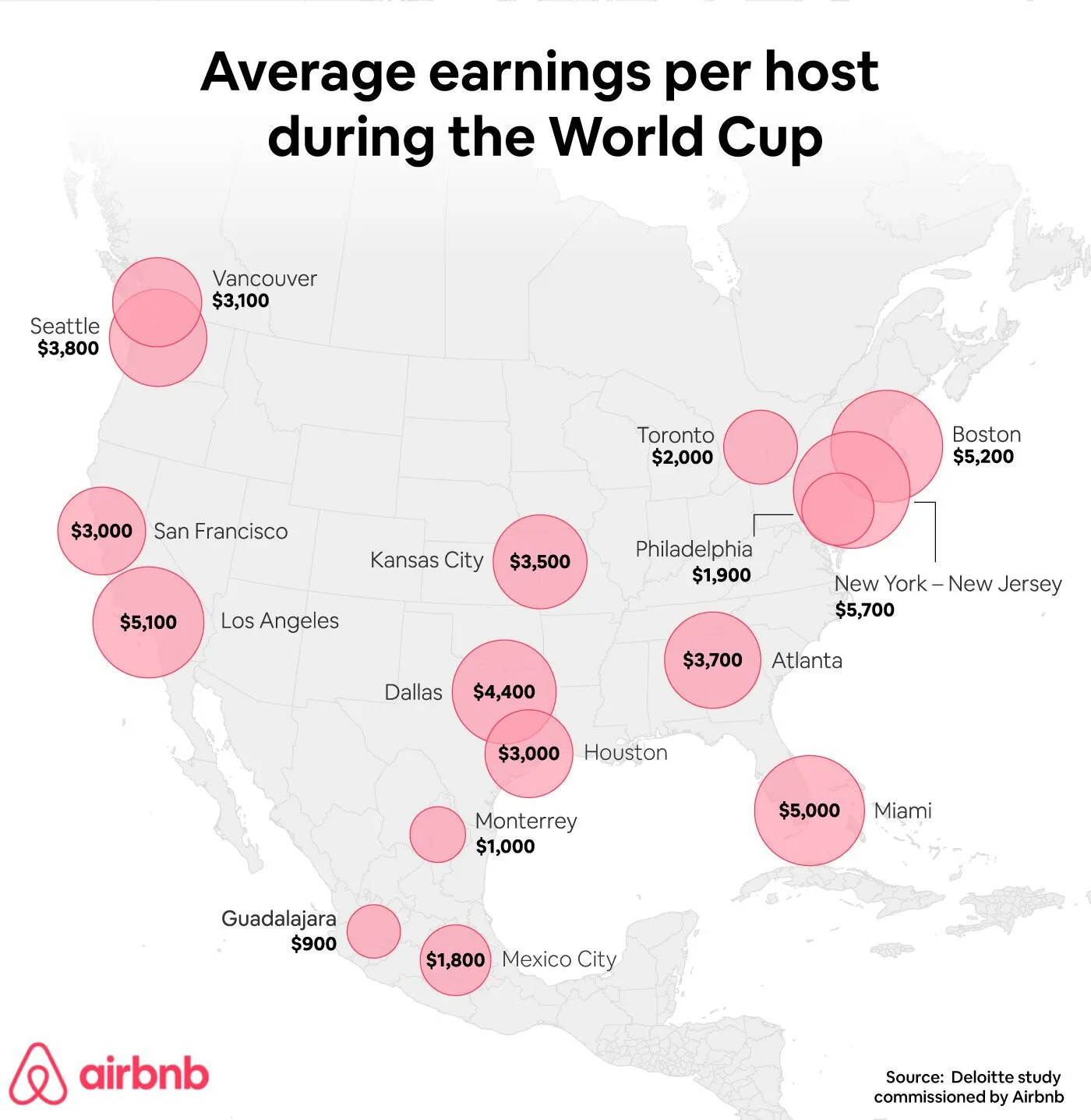 Deloitte (commissioned by Airbnb) projects hosts will average ~$4,000 at an average daily rate of ~$262, with New York leading at ~$5,700. Fortune reports tri-state properties at premium rates of $6,000/night. New Jersey property managers are tripling rates - one luxury rental could clear $240,000 across the 6-week window.